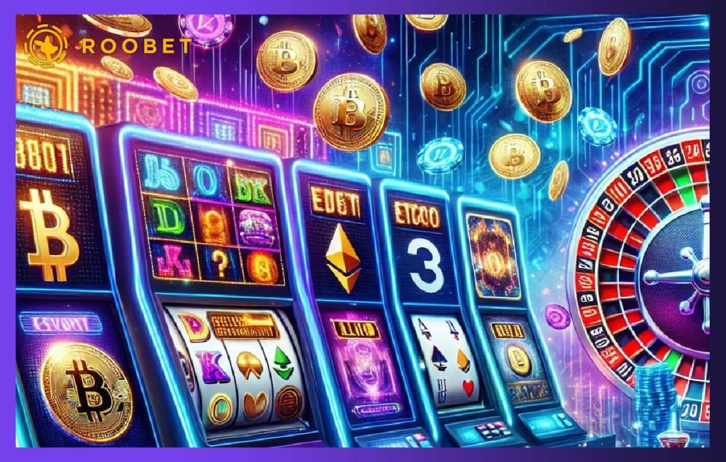 Row of slot machines and a roulette wheel played with crypto